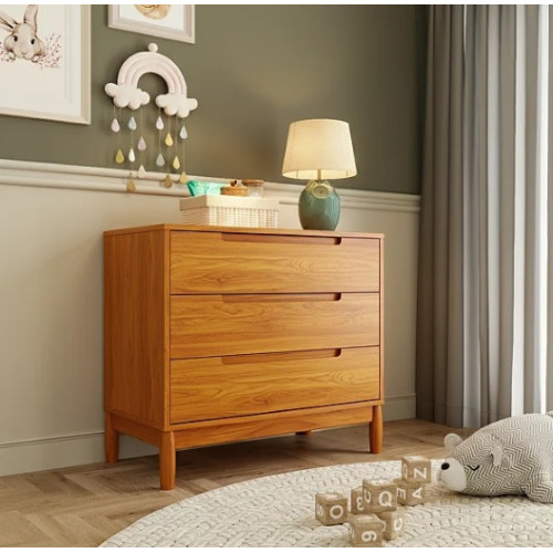 Cômoda de MDF laminado na cor nature com pés de madeira maciça. 3 gavetas, sendo a primeira com divisórias tipo colmeia. Corrediças de trilho telescópico e fundos reforçados.