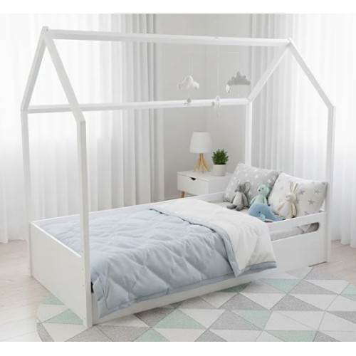 Cama montessoriana 100% MDF, laqueada na cor branco acetinado com casinha laqueada na cor branco acetinado.