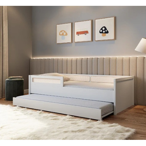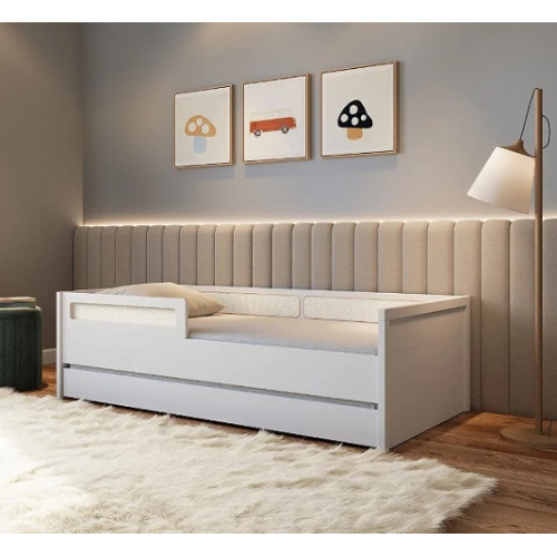 Bicama de MDF laqueada na cor branca e detalhes RATTAN no encosto e grade frontal. Estrados de ripas de pinus parafusados . Cama auxiliar com rodízio.