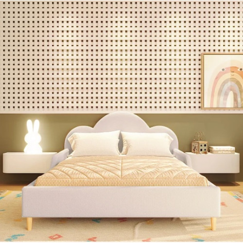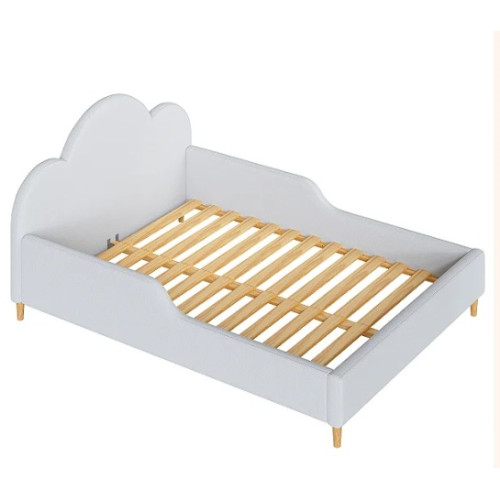 Cama do tipo montessoriana estofada com espuma D23 e coberta com tecido suave bouclé. Estrado com ripas de pinus parafusadas e transformação na altura com pés de pinus, acompanhando o crescimento do bebê.
